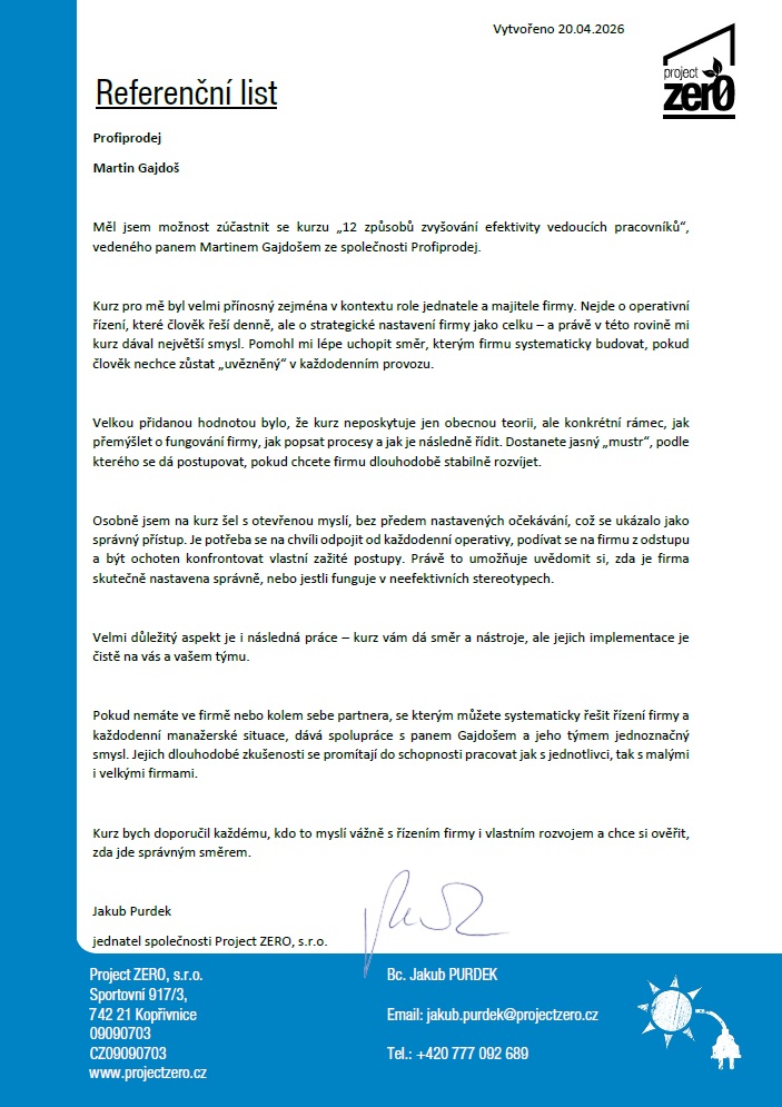 Na konci srpna 2020 jsme se zúčastnili tréningu zaměřeného na prodejní dovednosti a musím říct, že nadmíru splnil naše očekávání. Odjížděli jsme se spoustou poznámek a s velkým nadšením do další práce. Potřebovali jsme nakopnout a to přesně jsme dostali. Skvělá byla ta praktická část, kde jsme si mezi sebou zkoušeli vést obchodní jednání a používali jsme při tom metody, které nám Martin ukázal.