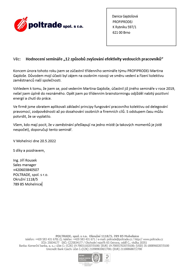 Rozhodně tuto investici do semináře nebo spolupráce doporučuji.