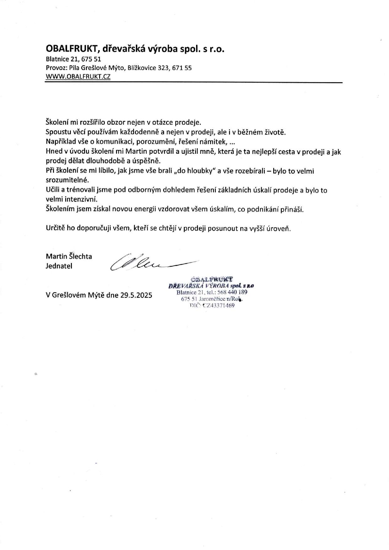 Bylo tedy nutností, abychom proškolili i naše zaměstnance. Jsem si jistý, že mí kolegové teď už chápou, že zákazník je pro nás ve firmě to nejdůležitější. Spolupráce s Vaší firmou mi pomohla i v soukromém životě. V nadhledu na zprávy a dění kolem mě. Nepodléhat okolní panice, negativitě a umět si vytvořit vlastní názor. Vážit si lidí kolem sebe, naslouchat a pomáhat jim. Zapojovat se více do pomoci ve veřejném životě. Podporovat lidi, kteří to potřebují. Rozhodně dlouhodobou spolupráci s Vámi doporučuji všem, kteří se chtějí učit, posouvat se v životě a chtějí vytvořit úspěšnou firmu nebo povznést tu stávající na vyšší úroveň.
